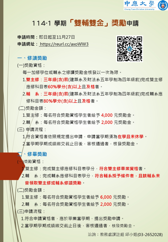 【中原大學114-1學期「雙輔雙金」獎勵申請】2025-10-21/在: 一般公告, 獎助學金, 最新消息 /通過: 傅文怡 ●本校「雙輔雙金」獎勵係為鼓勵學生修讀雙主修、輔系,完成學位取得證書,獎勵內容包含「修讀雙主修」、「修讀輔系」、「修畢雙主修」及「修畢輔系」4類。 ●鼓勵符合條件之學生踴躍申請! ●申請網址:https://reurl.cc/axoWW3 https://eeweb.cycu.edu.tw/wp-content/uploads/2025/10/114-1學期雙輔雙金獎勵申請宣傳海報_page-0001.jpg 1625 1125 傅文怡 /wp-content/uploads/2022/11/電機LOGO-.png 傅文怡2025-10-21 09:08:412025-10-21 09:08:41【中原大學114-1學期「雙輔雙金」獎勵申請】