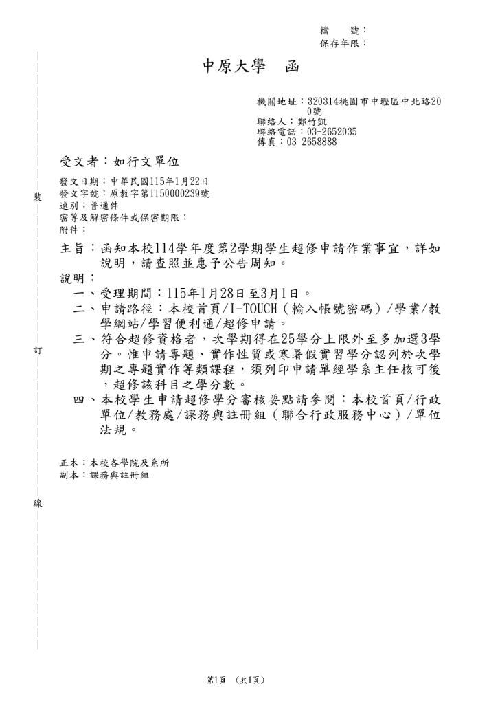 【中原大學114-2學生超修申請作業事宜-公告】2026-02-02/在: 最新消息, 一般公告 /通過: 傅文怡 1.受理期間:115年1月28日至3月1日。 2.申請路徑:本校首頁/I-TOUCH(輸入帳號密碼)/學業/教學網站/學習便利通/超修申請。 3.符合超修資格者,次學期得在25學分上限外至多加選3學分。 /wp-content/uploads/2022/11/電機LOGO-.png 0 0 傅文怡 /wp-content/uploads/2022/11/電機LOGO-.png 傅文怡2026-02-02 13:56:142026-02-02 13:56:14【中原大學114-2學生超修申請作業事宜-公告】