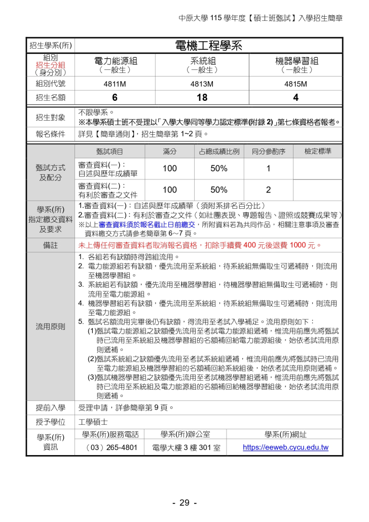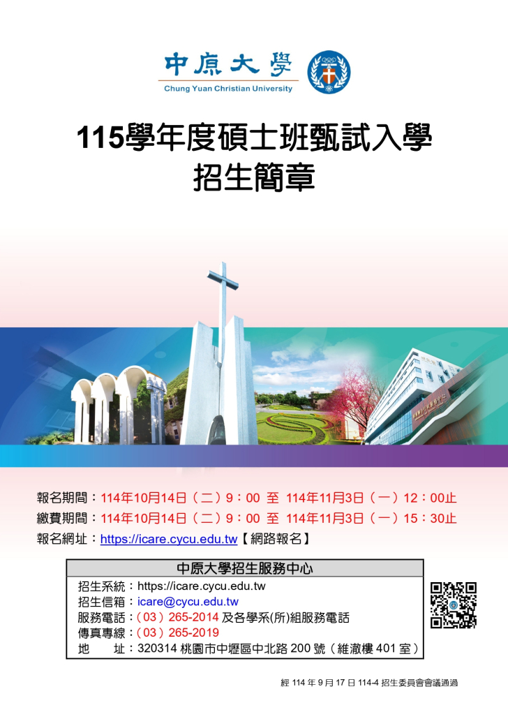 【115學年度-電機系碩士班甄試公告】2025-10-17/在: 招生訊息, 最新消息, 一般公告 /通過: 傅文怡 ●報名日期:114年10月14日~114年11月3日中午12:00止 ●簡章及報名網址:https://icare.cycu.edu.tw/ https://eeweb.cycu.edu.tw/wp-content/uploads/2025/10/115碩士班甄試招生簡章_1140918定稿_page-0001.jpg 1755 1241 傅文怡 /wp-content/uploads/2022/11/電機LOGO-.png 傅文怡2025-10-17 17:08:062025-10-17 17:20:28【115學年度-電機系碩士班甄試公告】