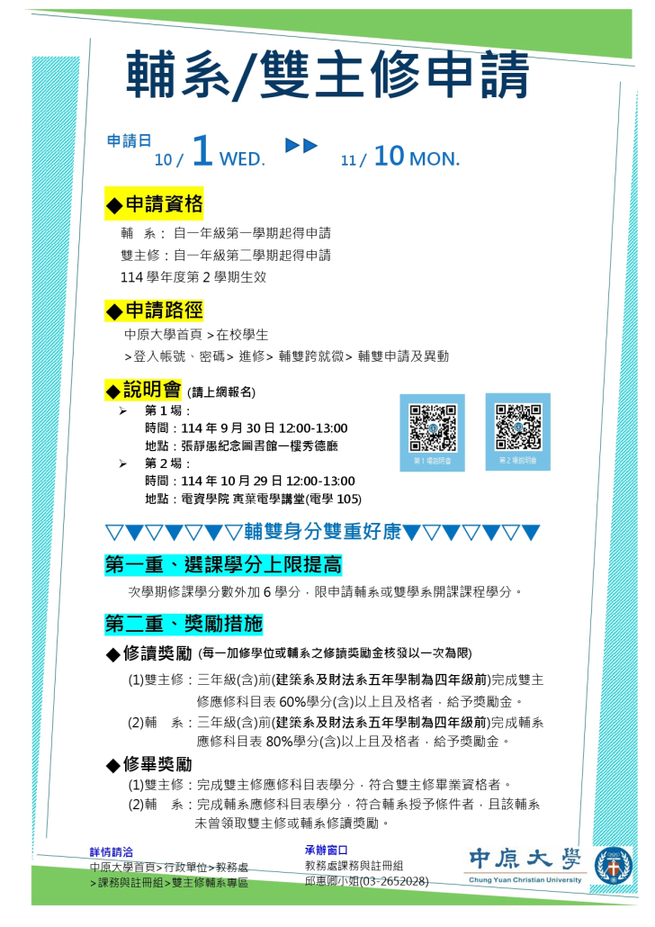 【114學年度第2學期輔系、雙主修申請公告】2025-09-22/在: 最新消息, 一般公告 /通過: 傅文怡 申請時間:114年10月1日至11月10日 申請路徑:本校首頁/I-TOUCH/登入itouch(輸入帳號密碼)/進修/輔雙跨就微/輔雙申請及異動。 申請說明會資訊如下,請鼓勵學生踴躍參加: (一)第1場說明會: 1、時間:114年9月30日12:00-13:00。 2、地點:張靜愚紀念圖書館1樓秀德廳。 (二)第2場說明會: 1、時間:114年10月29日12:00-13:00。 2、地點:電學大樓1樓寅葉電學講堂。 https://eeweb.cycu.edu.tw/wp-content/uploads/2025/09/114-1輔雙申請海報-1_page-0001.jpg 1755 1241 傅文怡 /wp-content/uploads/2022/11/電機LOGO-.png 傅文怡2025-09-22 14:42:412025-09-22 14:42:41【114學年度第2學期輔系、雙主修申請公告】