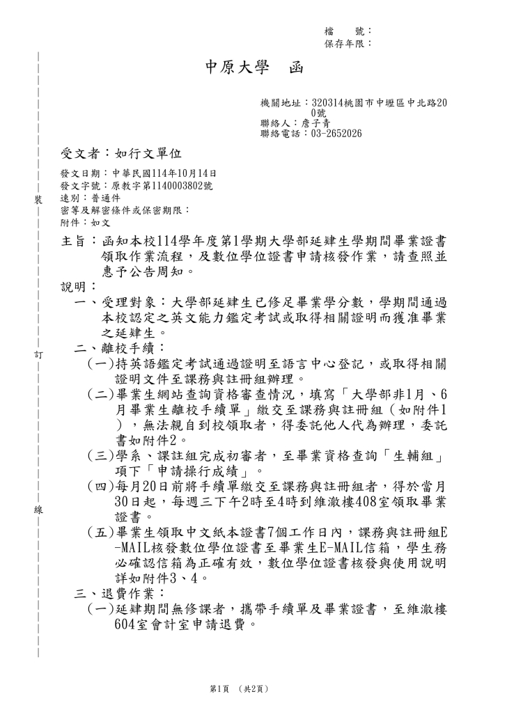 傅文怡2025-10-23 10:17:412025-10-23 15:09:06【114-1學期-大學部延肄生學期間畢業證書領取作業流程,及數位學位證書申請】