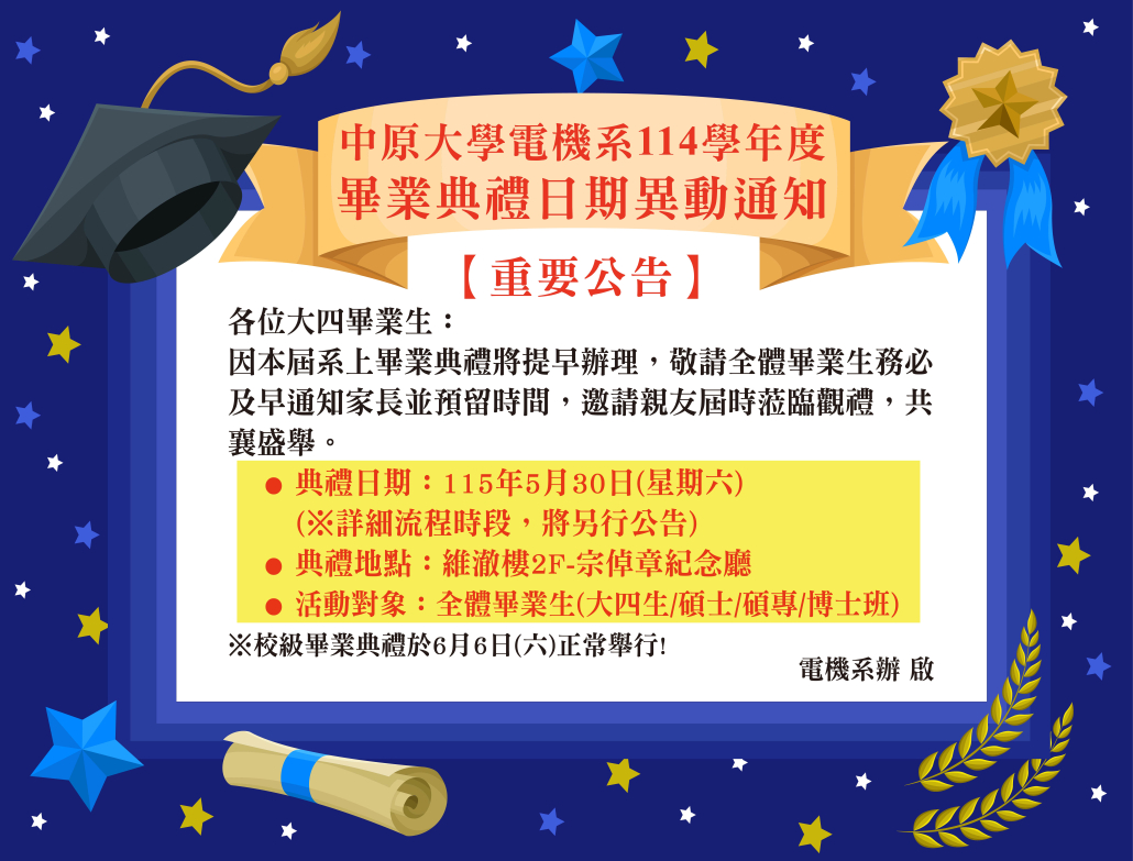 【114-2電機系畢業典禮日期異動通知】系上畢業典禮5/30(六)維澈樓(2F宗倬章紀念廳)舉行!