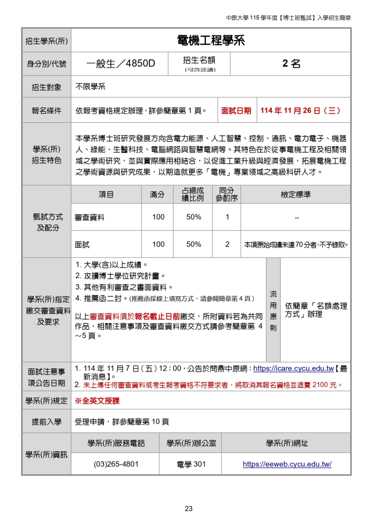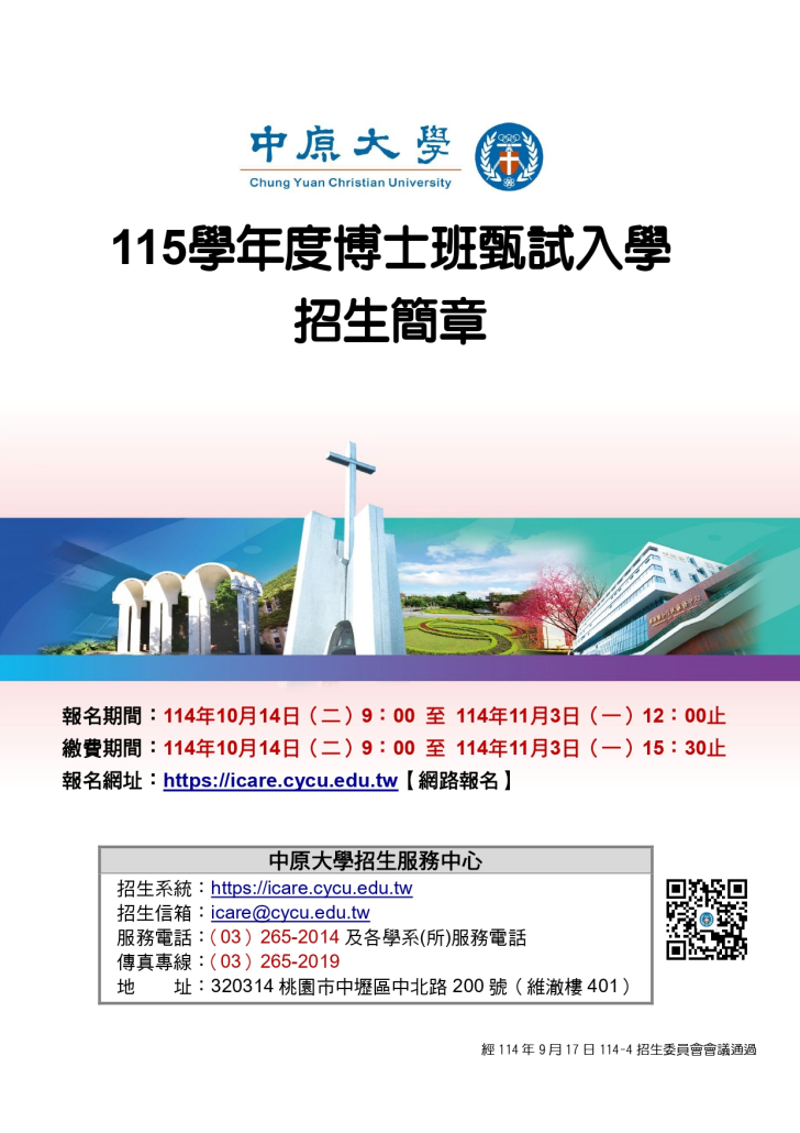 【115學年度-電機系博士班甄試公告】2025-10-17/在: 最新消息, 一般公告, 招生訊息 /通過: 傅文怡 ●報名日期:114年10月14日~114年11月3日中午12:00止 ●簡章及報名網址:https://icare.cycu.edu.tw/ https://eeweb.cycu.edu.tw/wp-content/uploads/2025/10/115博士班甄試招生簡章_1140918定稿_page-0001.jpg 1755 1241 傅文怡 /wp-content/uploads/2022/11/電機LOGO-.png 傅文怡2025-10-17 17:23:022025-10-17 17:23:02【115學年度-電機系博士班甄試公告】