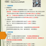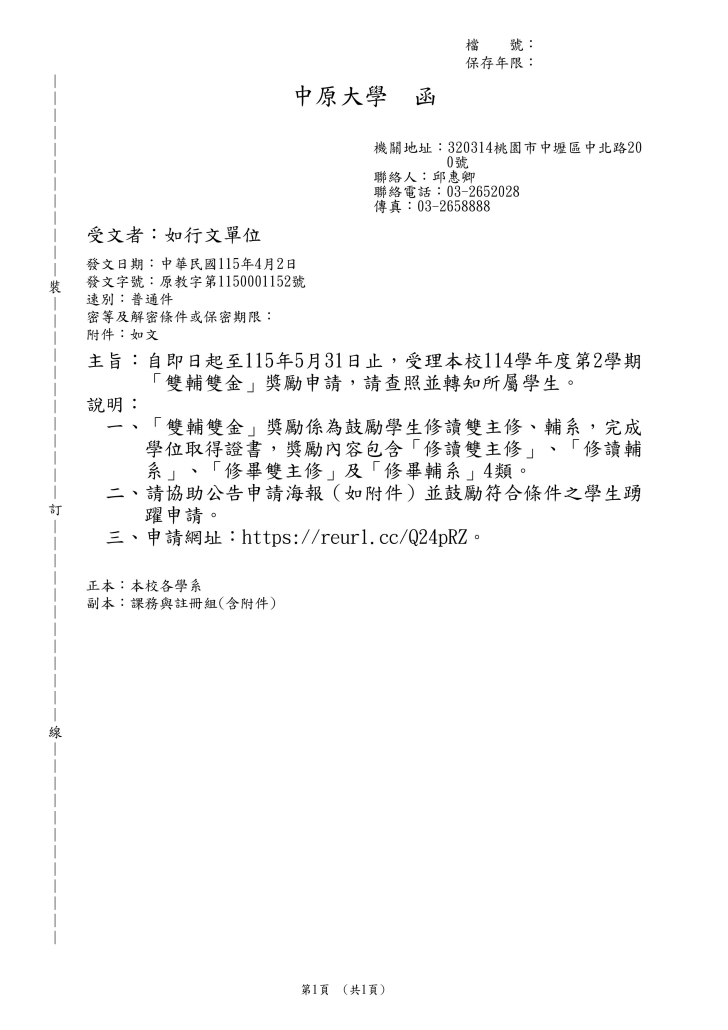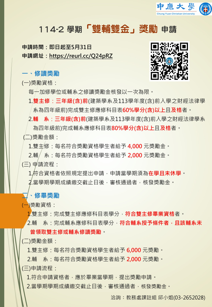【114-2學期中原大學「雙輔雙金」獎勵申請公告】2026-04-07/在: 獎助學金, 最新消息, 一般公告 /通過: 傅文怡 1.「雙輔雙金」獎勵係為鼓勵學生修讀雙主修、輔系,完成學位取得證書,獎勵內容包含「修讀雙主修」、「修讀輔系」、「修畢雙主修」及「修畢輔系」4類。 2.申請網址:https://reurl.cc/Q24pRZ https://eeweb.cycu.edu.tw/wp-content/uploads/2026/04/114-2學期雙輔雙金獎勵申請宣傳海報-scaled.jpg 2560 1772 傅文怡 /wp-content/uploads/2022/11/電機LOGO-.png 傅文怡2026-04-07 09:24:242026-04-07 14:25:21【114-2學期中原大學「雙輔雙金」獎勵申請公告】
